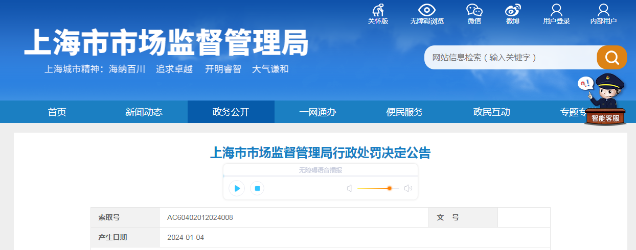 上海市市場(chǎng)監(jiān)督管理局行政處罰決定公告