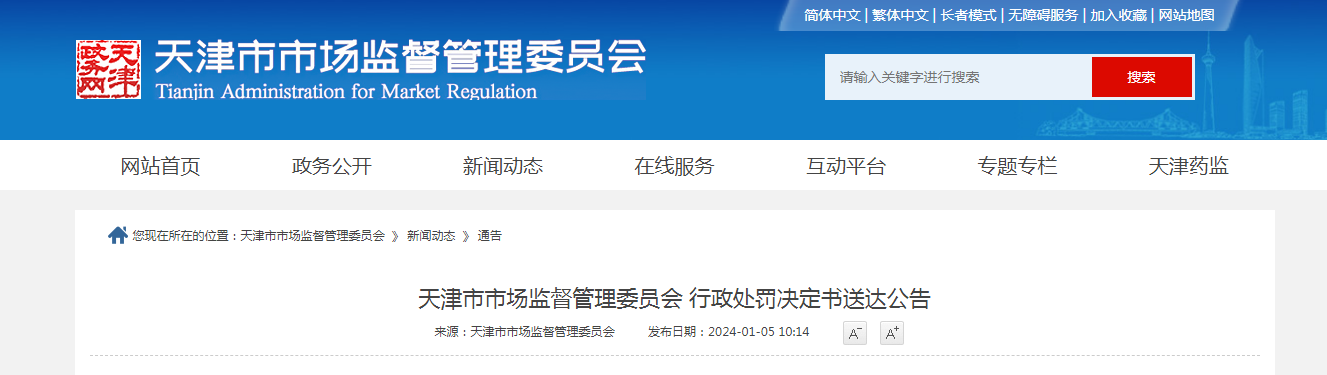 天津市市場監(jiān)督管理委員會行政處罰決定書送達(dá)公告