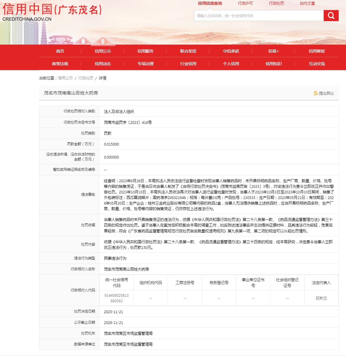 茂名市茂南高山百姓大藥房銷售藥品未開具銷售憑證案