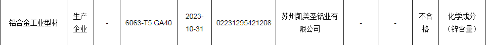中國質(zhì)量新聞網(wǎng)訊(閆冬)日前,蘇州市市場監(jiān)督管理局發(fā)布《2023年鋁合金工業(yè)型材產(chǎn)品質(zhì)量市級監(jiān)督抽查情況公告(第97期)》。本次共抽查鋁合金工業(yè)型材產(chǎn)品20批次,合格19批次,合格率為95%。標稱蘇州凱美圣鋁業(yè)有限公司生產(chǎn)的鋁合金工業(yè)型材(規(guī)格型號:6063-T5 GA40 生產(chǎn)日期:2023-10-31 批號:02231295421208)“化學成分(鋅含量)”項目不合格。