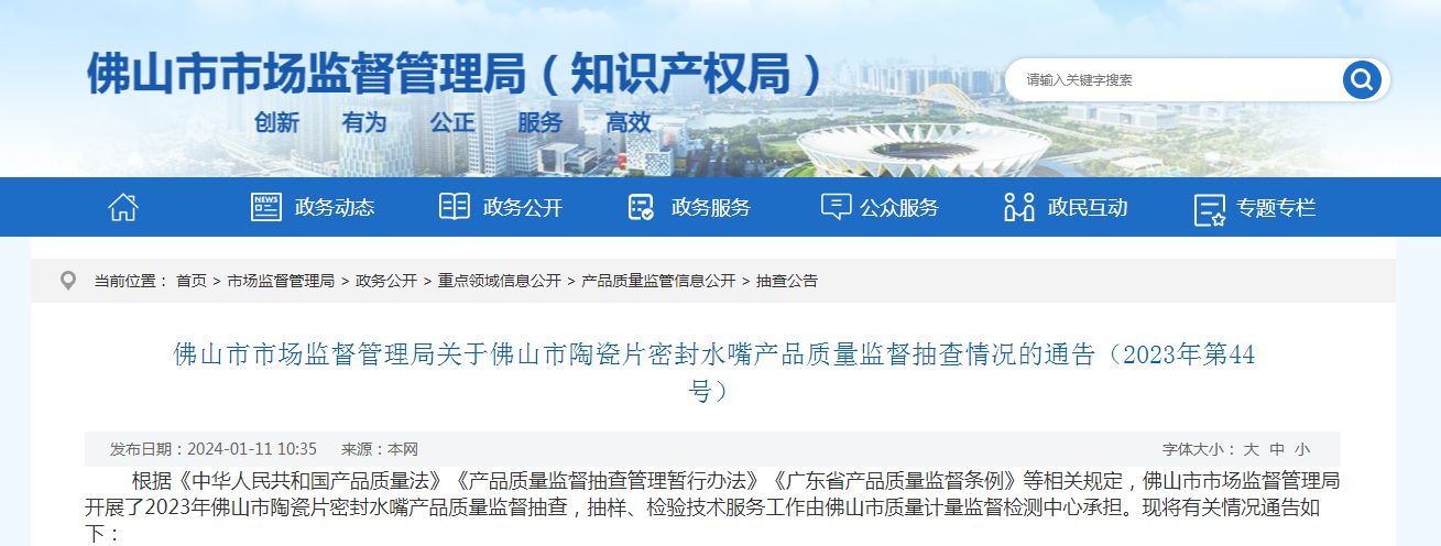佛山市市場監(jiān)督管理局關(guān)于佛山市陶瓷片密封水嘴產(chǎn)品質(zhì)量監(jiān)督抽查情況的通告(2023年第44號)
