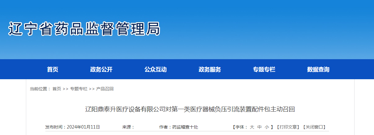 遼陽(yáng)鼎泰升醫(yī)療設(shè)備有限公司報(bào)告,由于負(fù)壓引流裝置配件包直通另一端口內(nèi)徑尺寸及直通長(zhǎng)度尺寸項(xiàng)目不符合遼遼械備20170004號(hào)產(chǎn)品技術(shù)要求,遼陽(yáng)鼎泰升醫(yī)療設(shè)備有限公司對(duì)其生產(chǎn)的負(fù)壓引流裝置配件包(備案號(hào):遼遼械備20170004號(hào))主動(dòng)召回,召回級(jí)別為三級(jí)。涉及產(chǎn)品的型號(hào)、規(guī)格及批次等詳細(xì)信息見《醫(yī)療器械召回事件報(bào)告表》。