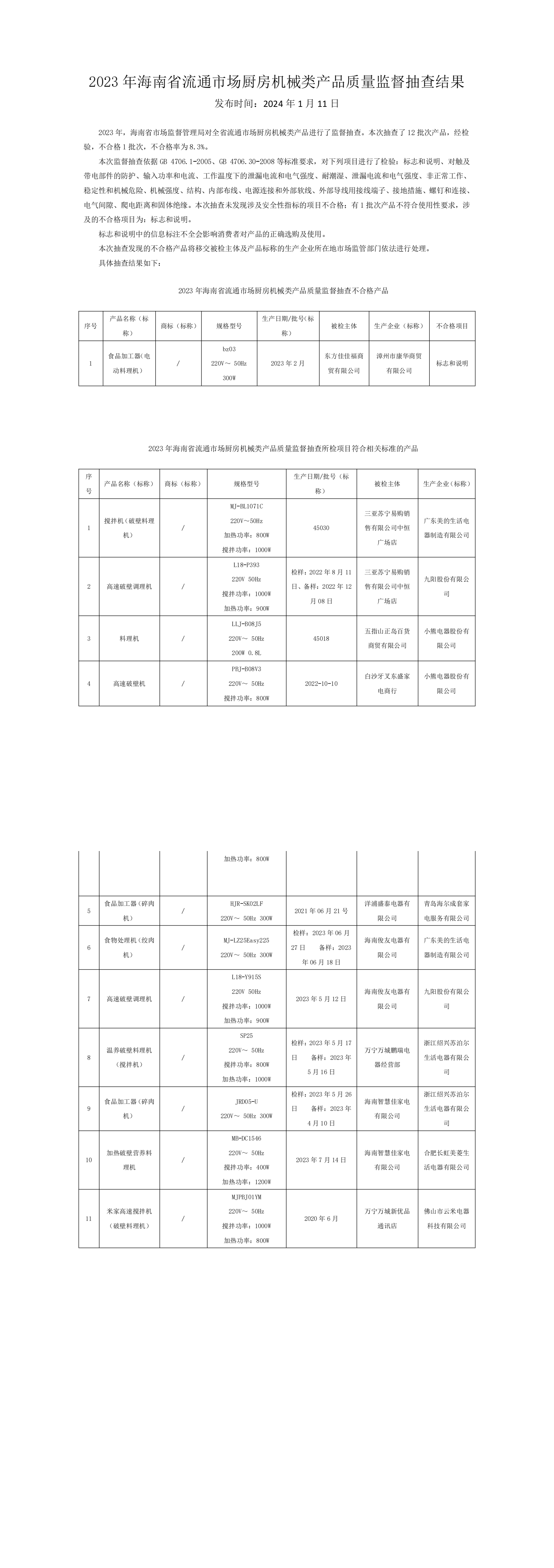 2023年海南省流通市場廚房機(jī)械類產(chǎn)品質(zhì)量監(jiān)督抽查結(jié)果
