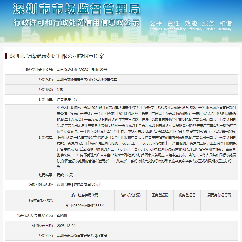 深圳市新鋒健康藥房有限公司虛假宣傳案