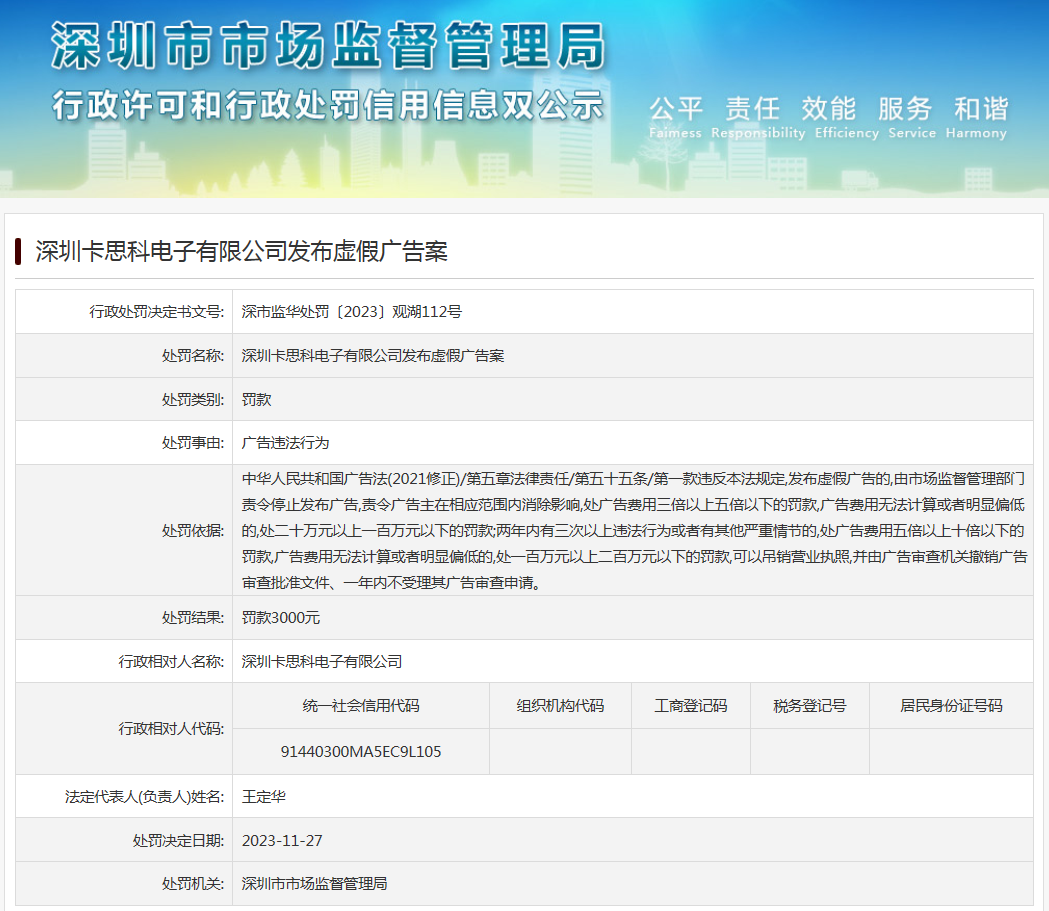 深圳卡思科電子有限公司發(fā)布虛假?gòu)V告案