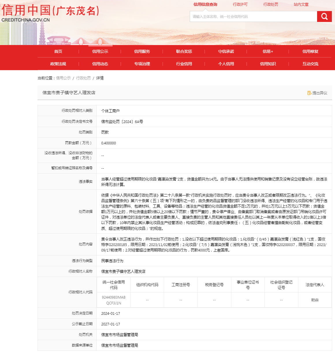 【廣東】信宜市貴子鎮(zhèn)守藝人理發(fā)店經(jīng)營超過使用期限的化妝品、無法提供使用和銷售記錄及沒有設(shè)立經(jīng)營臺賬案