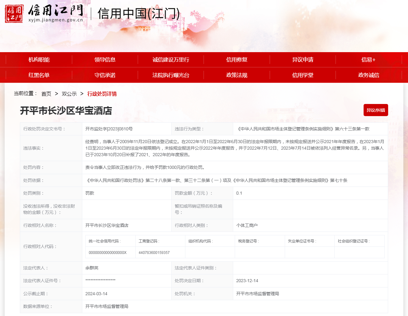 【廣東】開平市長沙區(qū)華寶酒店未按規(guī)定報送年度報告案