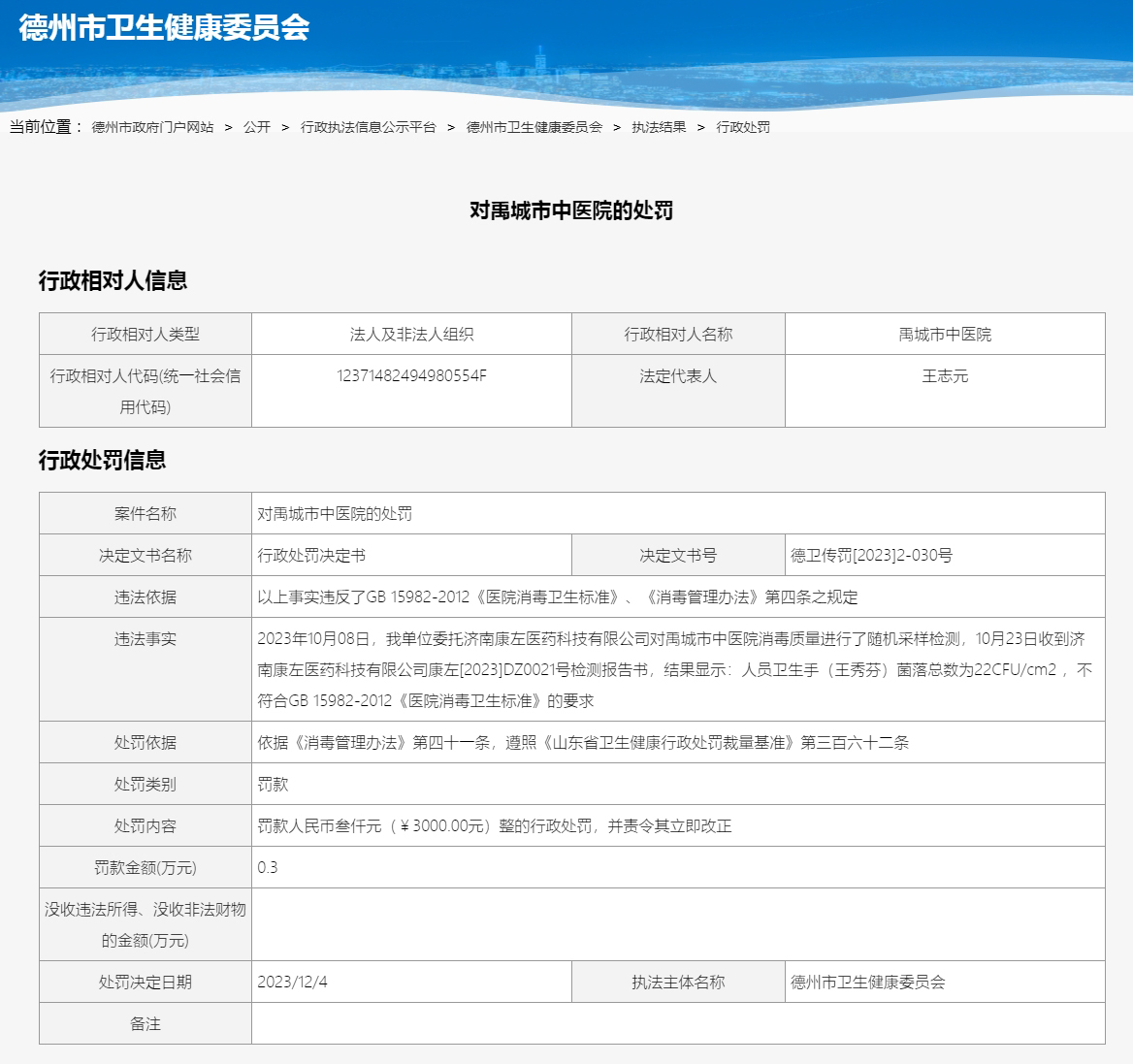 對(duì)禹城市中醫(yī)院的處罰