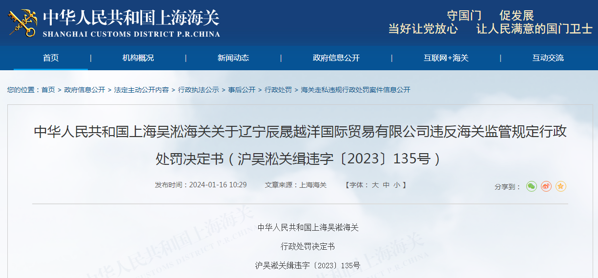 關(guān)于遼寧辰晟越洋國(guó)際貿(mào)易有限公司違反海關(guān)監(jiān)管規(guī)定行政處罰決定書(滬吳淞關(guān)緝違字〔2023〕135號(hào))