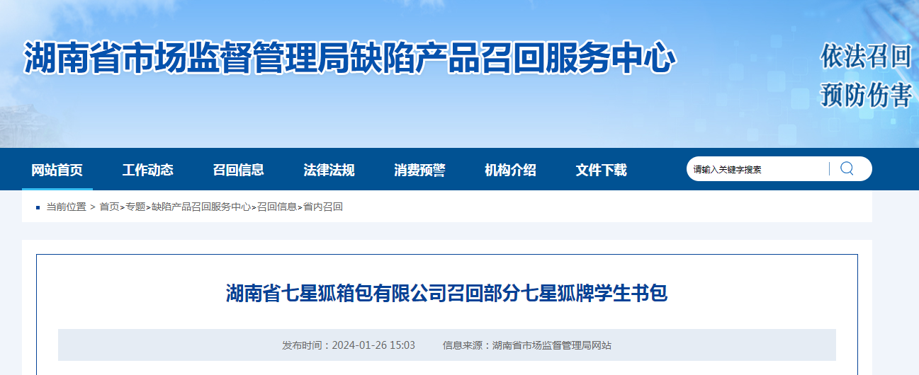 湖南省七星狐箱包有限公司召回部分七星狐牌學(xué)生書包