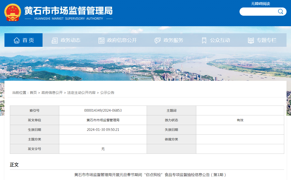 黃石市市場(chǎng)監(jiān)督管理局開(kāi)展元旦春節(jié)期間“你點(diǎn)我檢”食品專項(xiàng)監(jiān)督抽檢信息公告(第1期)