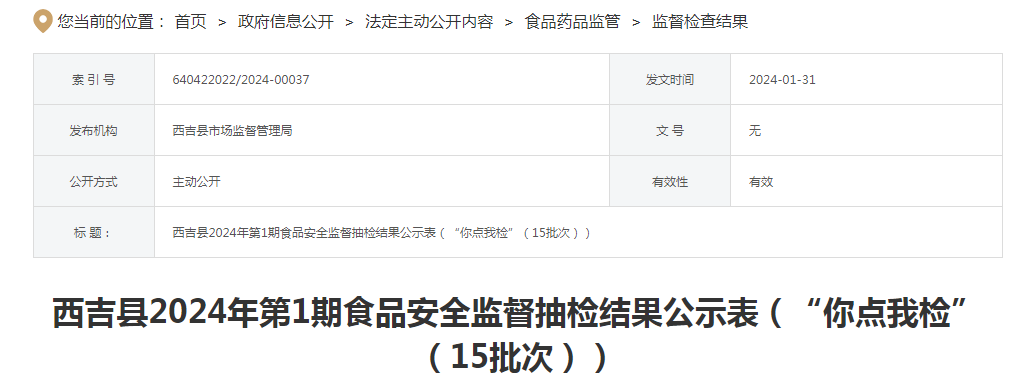 西吉縣2024年第1期食品安全監(jiān)督抽檢結(jié)果公示表[“你點(diǎn)我檢”(15批次)]