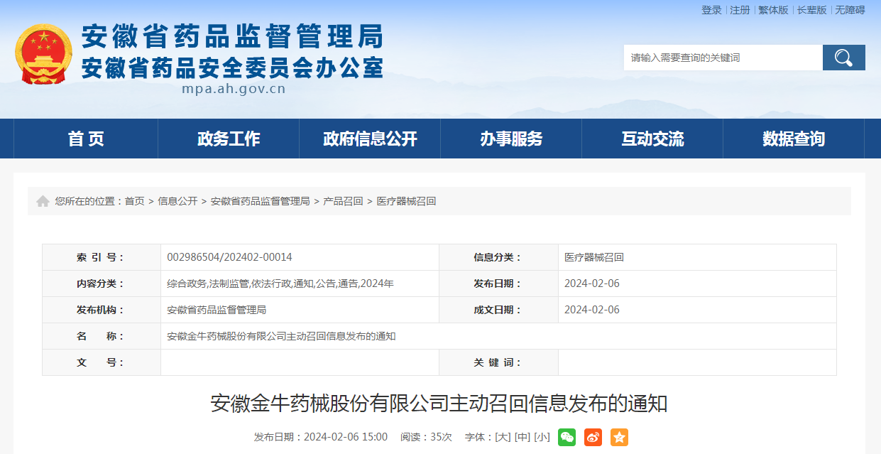 安徽金牛藥械股份有限公司報告:批號為20230612的萬通筋骨貼抽檢不合格,安徽金牛藥械股份有限公司報告對其生產(chǎn)的批號20230612的萬通筋骨貼主動召回,召回級別為三級。