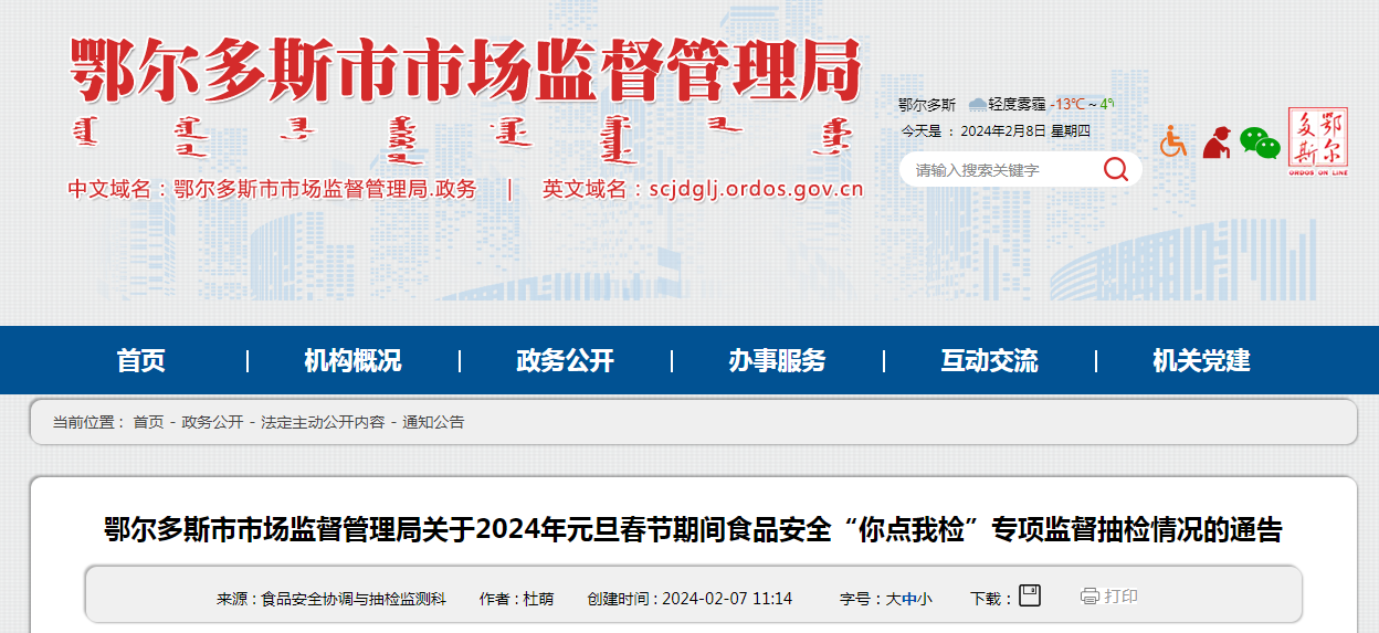 鄂爾多斯市市場監(jiān)督管理局關(guān)于2024年元旦春節(jié)期間食品安全“你點我檢”專項監(jiān)督抽檢情況的通告