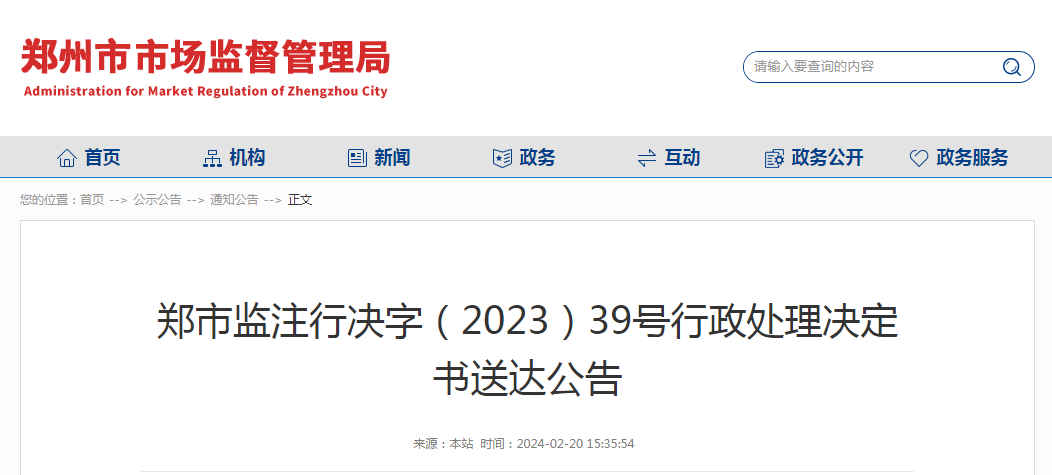 鄭州市市場(chǎng)監(jiān)督管理局行政處理文書(shū)送達(dá)公告