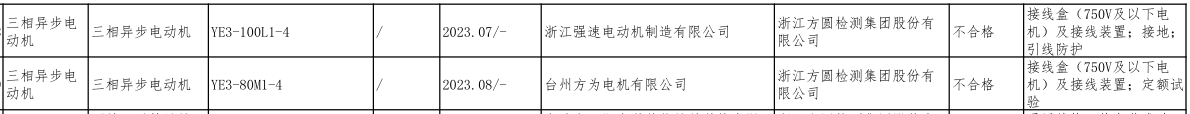 不合格產(chǎn)品涉及浙江振宏機(jī)電有限公司、溫州南洋防爆電機(jī)有限公司、浙江錢濤泵業(yè)股份有限公司、上海山界電機(jī)有限公司溫嶺大溪分公司、浙江長利電機(jī)有限公司、上海如利機(jī)電有限公司路南分公司、尼豐機(jī)電股份有限公司、浙江傲速電機(jī)制造有限公司、臺州方為電機(jī)有限公司等公司。