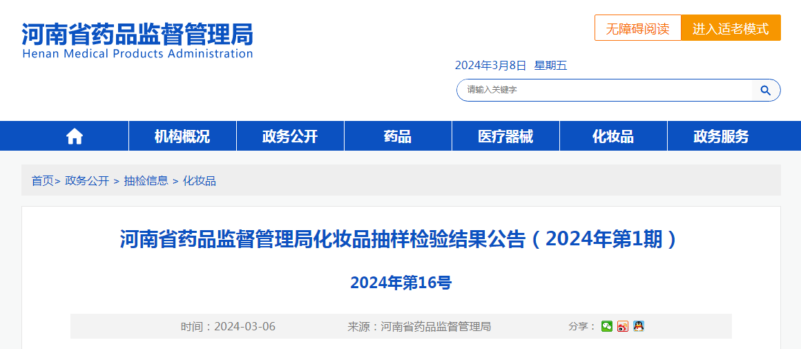 河南省藥品監(jiān)督管理局化妝品抽樣檢驗(yàn)結(jié)果公告(2024年第1期)