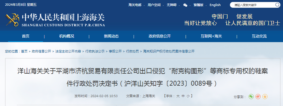 洋山海關(guān)關(guān)于平湖市濟(jì)杭貿(mào)易有限責(zé)任公司出口侵犯“耐克鉤圖形”等商標(biāo)專用權(quán)的鞋案件行政處罰決定書(shū)(滬洋山關(guān)知字〔2023〕0089號(hào))
