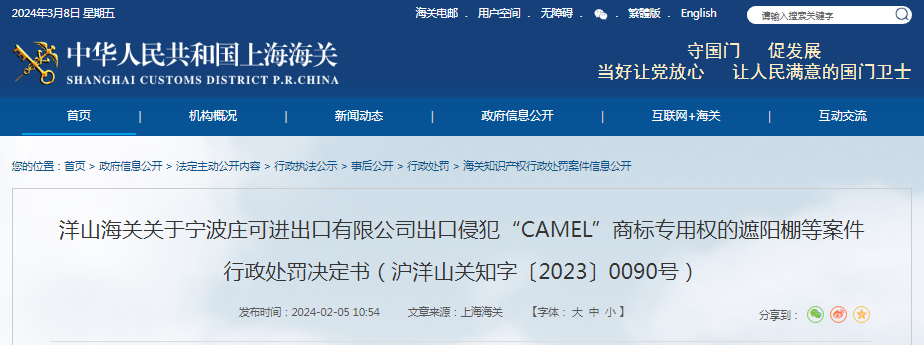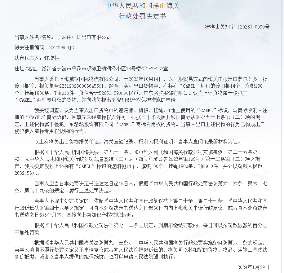 洋山海關(guān)關(guān)于寧波莊可進(jìn)出口有限公司出口侵犯“CAMEL”商標(biāo)專(zhuān)用權(quán)的遮陽(yáng)棚等案件行政處罰決定書(shū)(滬洋山關(guān)知字〔2023〕0090號(hào))