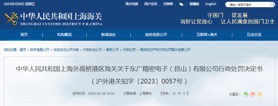 中華人民共和國(guó)上海外高橋港區(qū)海關(guān)關(guān)于東廣精密電子(昆山)有限公司行政處罰決定書(滬外港關(guān)知字〔2023〕0057號(hào))