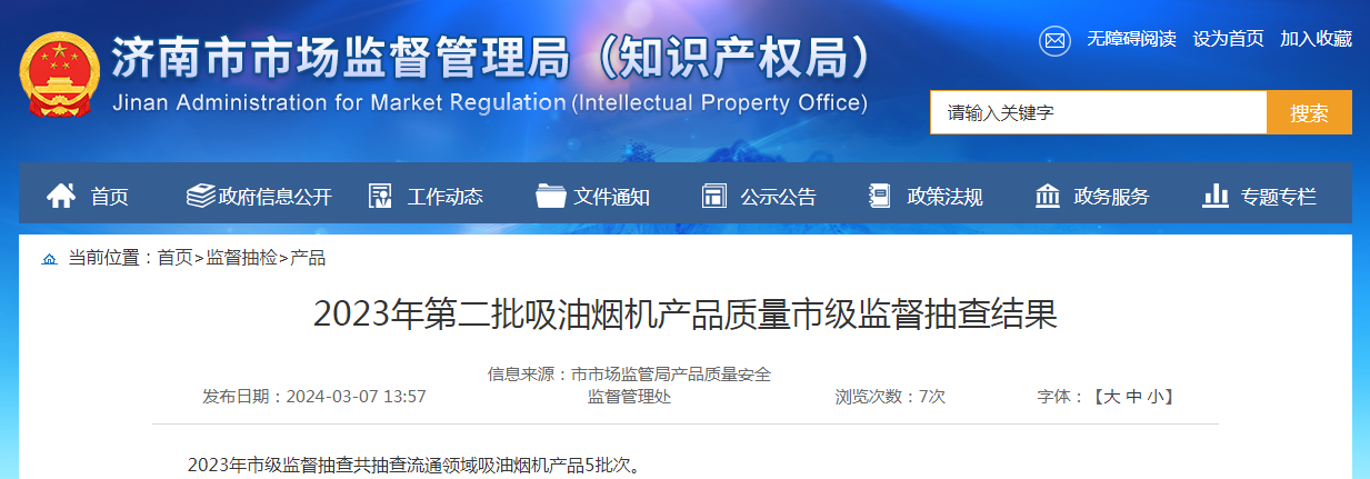 2023年市級監(jiān)督抽查共抽查流通領域吸油煙機產品5批次。