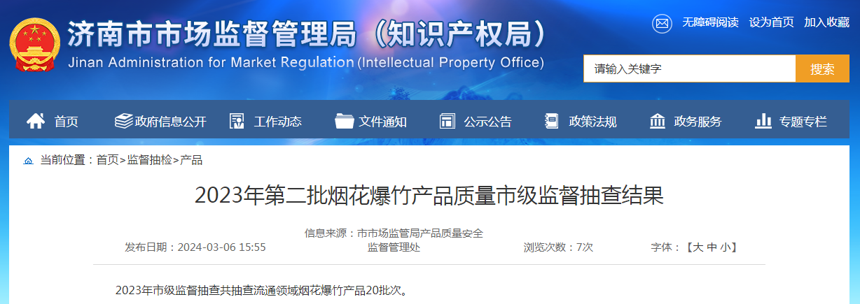 2023年市級監(jiān)督抽查共抽查流通領(lǐng)域煙花爆竹產(chǎn)品20批次。