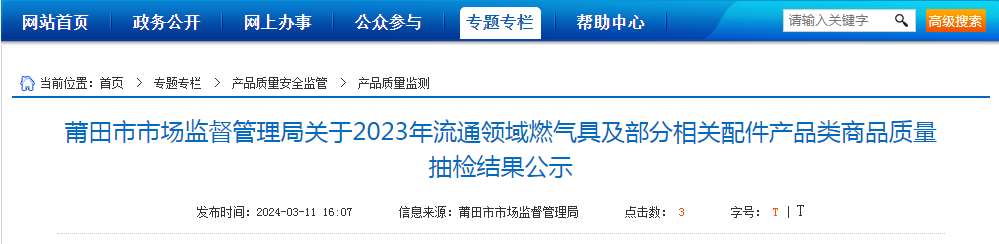 莆田市市場(chǎng)監(jiān)督管理局關(guān)于2023年流通領(lǐng)域燃?xì)饩呒安糠窒嚓P(guān)配件產(chǎn)品類商品質(zhì)量抽檢結(jié)果公示