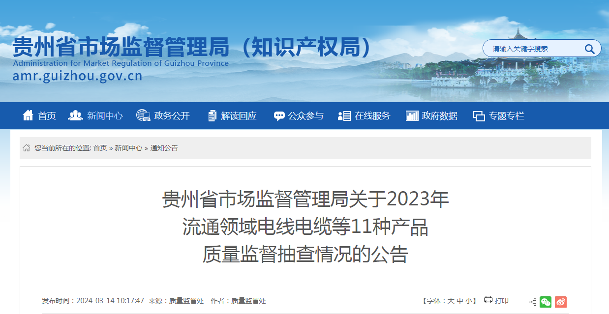 貴州省市場監(jiān)督管理局關(guān)于2023年流通領(lǐng)域電線電纜等11種產(chǎn)品質(zhì)量監(jiān)督抽查情況的公告