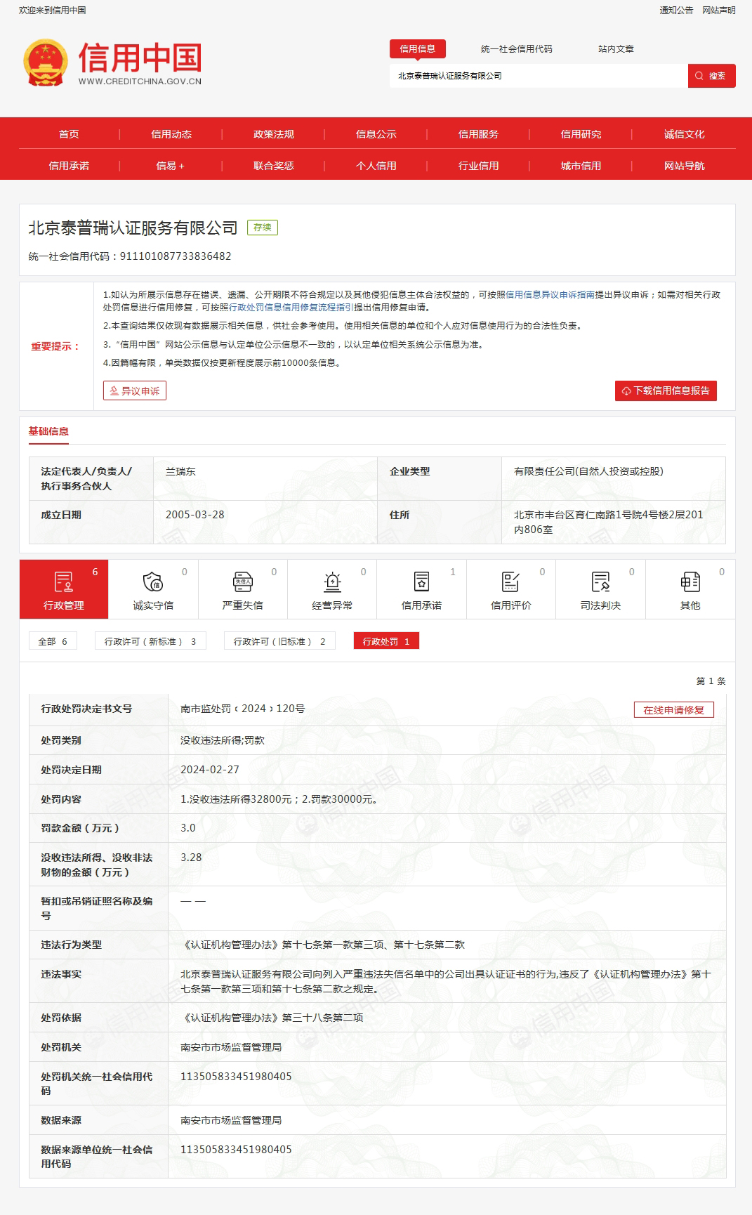 違法事實(shí):北京泰普瑞認(rèn)證服務(wù)有限公司向列入嚴(yán)重違法失信名單中的公司出具認(rèn)證證書(shū)的行為,違反了《認(rèn)證機(jī)構(gòu)管理辦法》第十七條第一款第三項(xiàng)和第十七條第二款之規(guī)定。