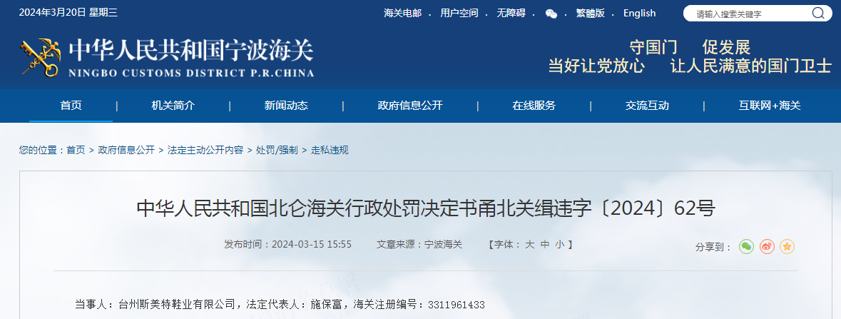 當(dāng)事人:臺州斯美特鞋業(yè)有限公司,法定代表人:施保富,海關(guān)注冊編號:3311961433