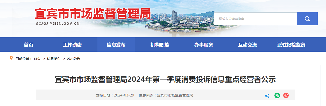 宜賓市市場監(jiān)督管理局2024年第一季度消費(fèi)投訴信息重點(diǎn)經(jīng)營者公示