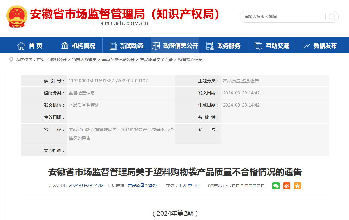 安徽省市場(chǎng)監(jiān)督管理局關(guān)于塑料購物袋產(chǎn)品質(zhì)量不合格情況的通告