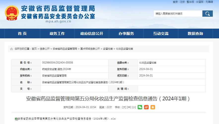 | 安徽省藥品監(jiān)督管理局第五分局化妝品生產(chǎn)監(jiān)督檢查信息通告(2024年1期) | |||||||