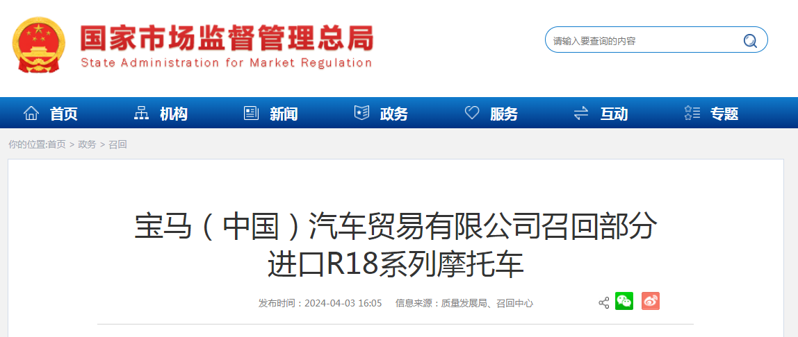 日前,寶馬(中國)汽車貿(mào)易有限公司根據(jù)《缺陷汽車產(chǎn)品召回管理條例》和《缺陷汽車產(chǎn)品召回管理條例實施辦法》的要求,向國家市場監(jiān)督管理總局備案了召回計劃。自即日起,召回2020年12月1日至2024年2月8日期間生產(chǎn)的部分進口R18系列摩托車,共計4118輛。