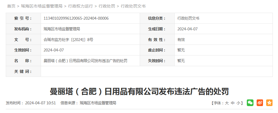 行政處罰決定書文號(hào):合瑤市監(jiān)方處字〔2024〕8號(hào)
