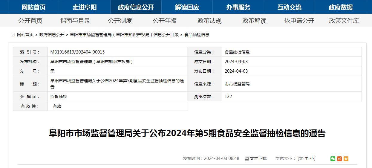 阜陽市市場(chǎng)監(jiān)督管理局關(guān)于公布2024年第5期食品安全監(jiān)督抽檢信息的通告