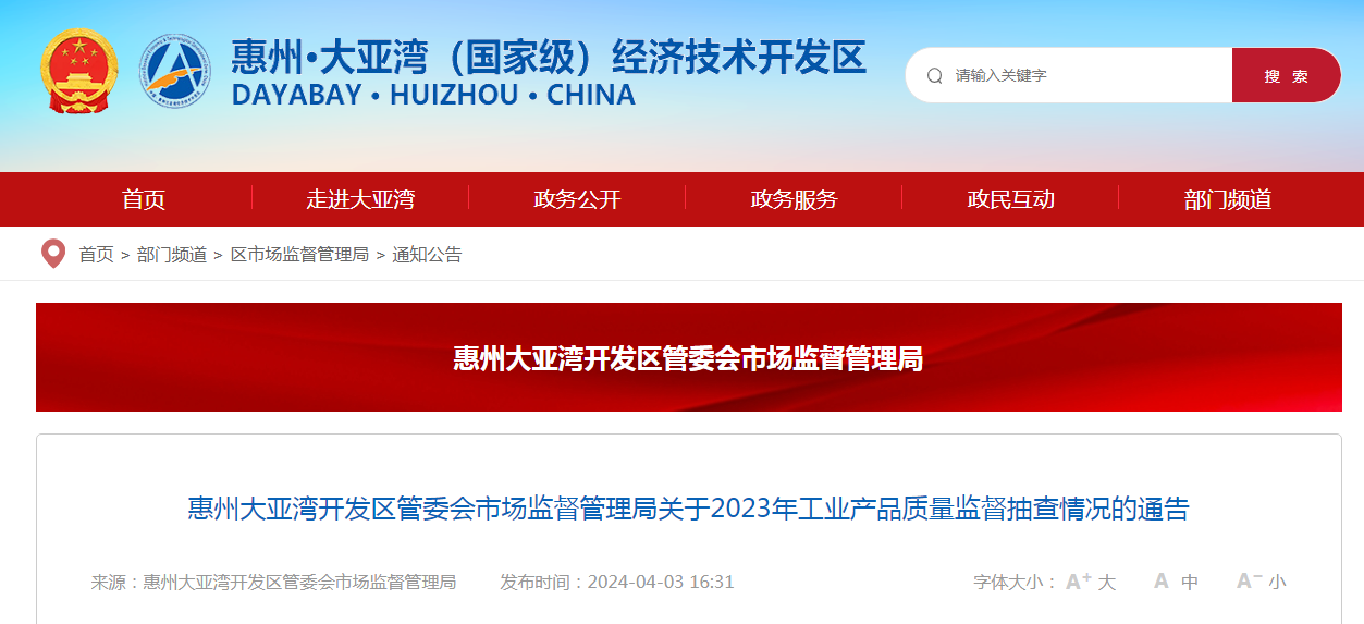 惠州大亞灣開(kāi)發(fā)區(qū)管委會(huì)市場(chǎng)監(jiān)督管理局關(guān)于2023年工業(yè)產(chǎn)品質(zhì)量監(jiān)督抽查情況的通告