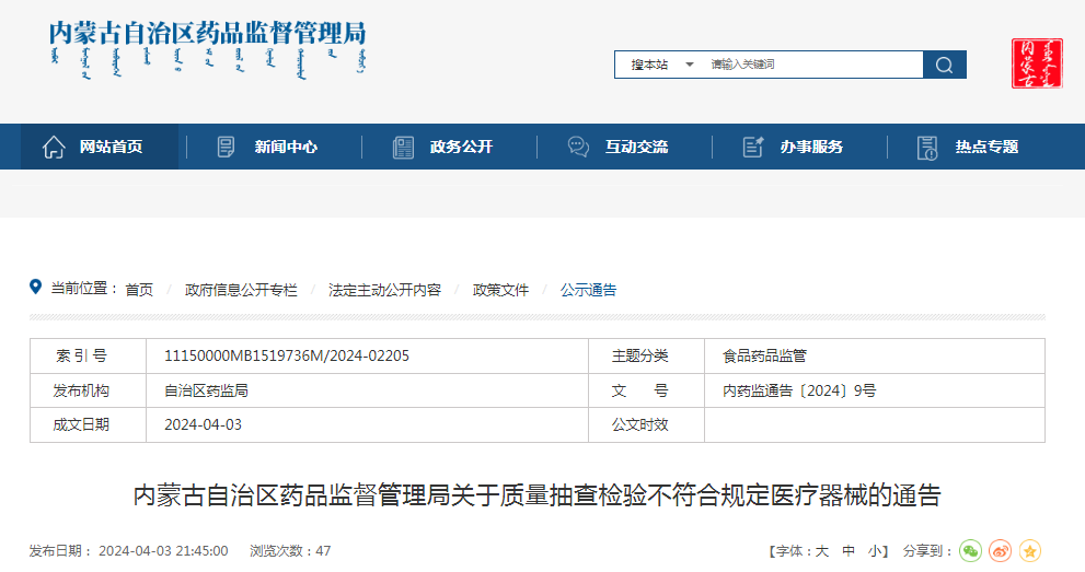 內(nèi)蒙古自治區(qū)藥品監(jiān)督管理局關(guān)于質(zhì)量抽查檢驗不符合規(guī)定醫(yī)療器械的通告