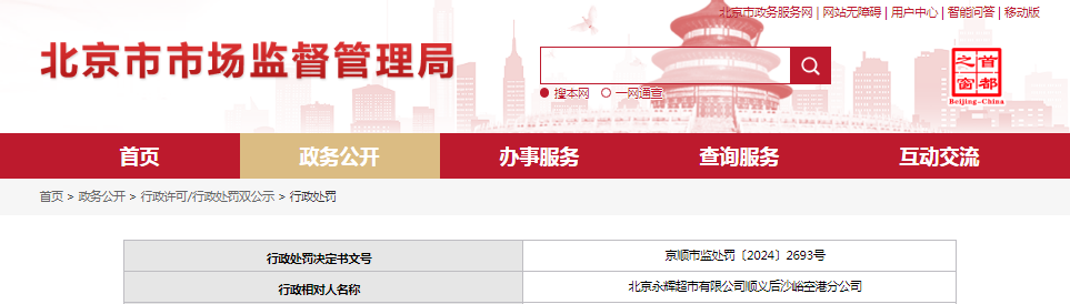 近日,北京市順義區(qū)市場監(jiān)督管理局對北京永輝超市有限公司順義后沙峪空港分公司作出行政處罰。具體信息如下: