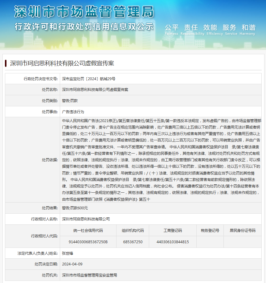 深圳市珂啟思利科技有限公司虛假宣傳案