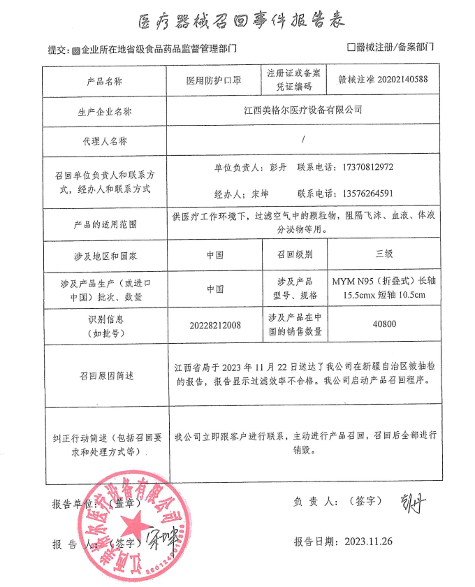 江西美格爾醫(yī)療設(shè)備有限公司召回醫(yī)用防護(hù)口罩