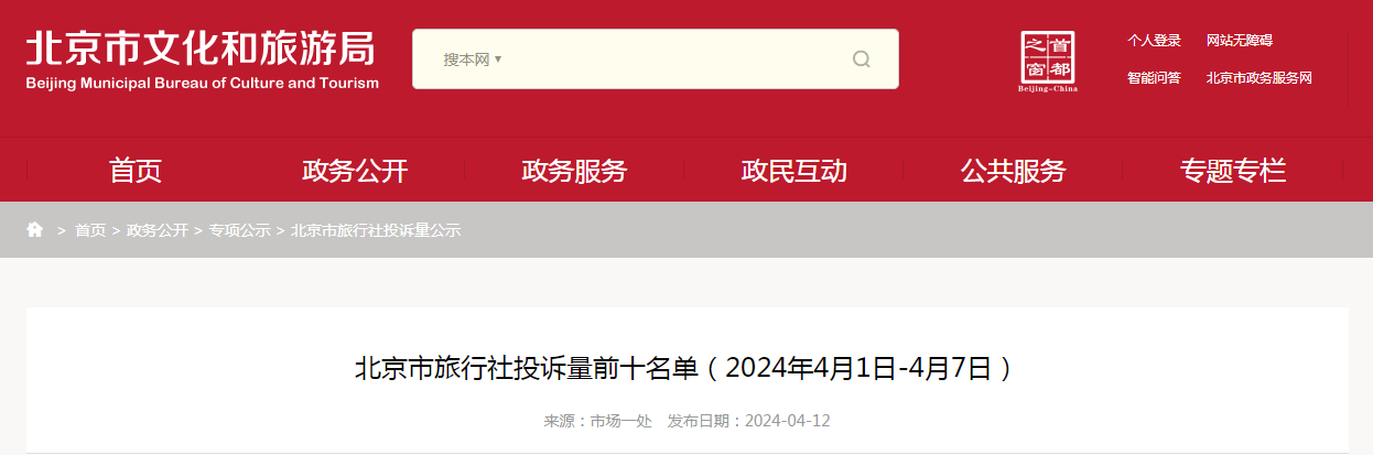 北京市旅行社投訴量前十名單(2024年4月1日-4月7日)