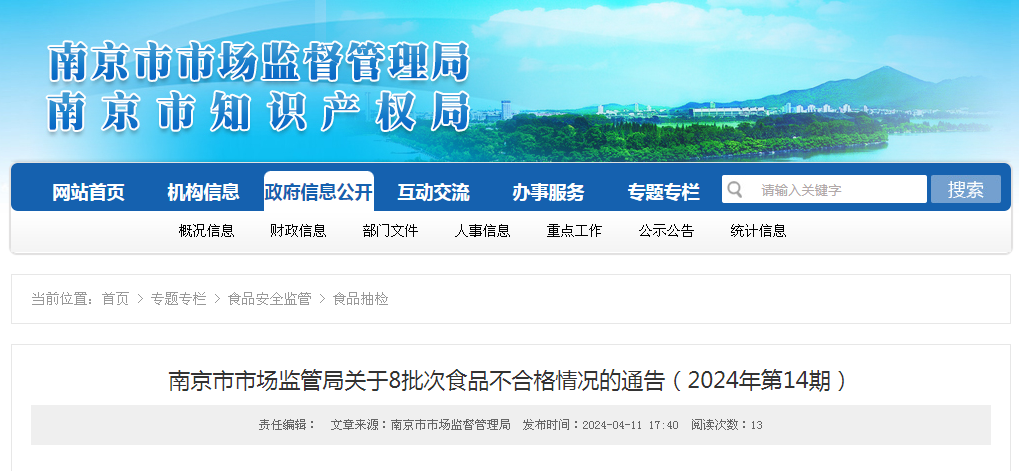 南京市市場監(jiān)管局關(guān)于8批次食品不合格情況的通告(2024年第14期)