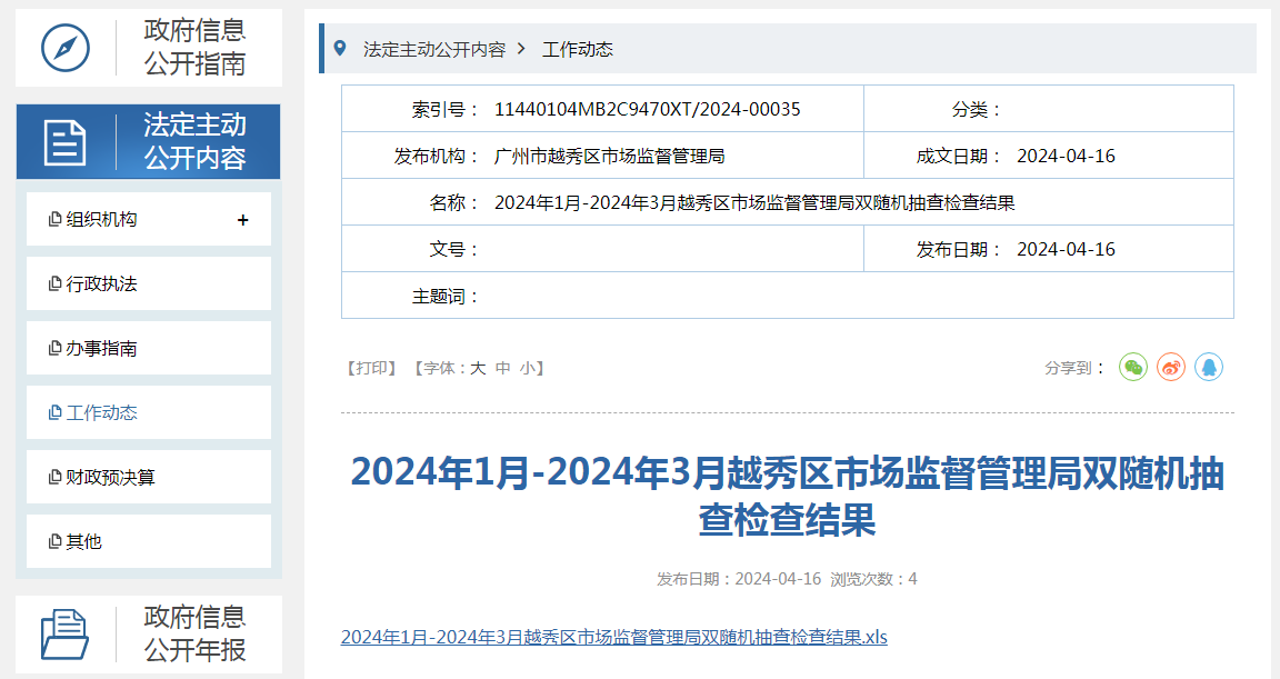 2024年1月-2024年3月廣州市越秀區(qū)市場監(jiān)督管理局雙隨機抽查檢查結(jié)果