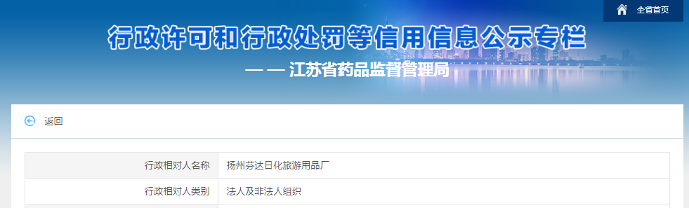 近日,江蘇省藥品監(jiān)督管理局對(duì)揚(yáng)州芬達(dá)日化旅游用品廠作出行政處罰。