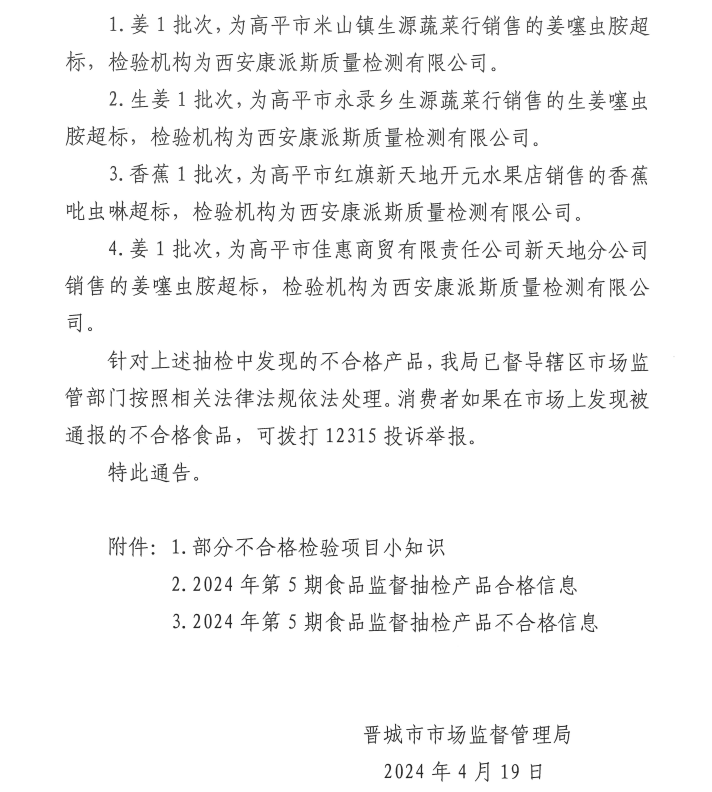 晉城市市場監(jiān)督管理局2024年第5期食品安全監(jiān)督抽檢信息通告