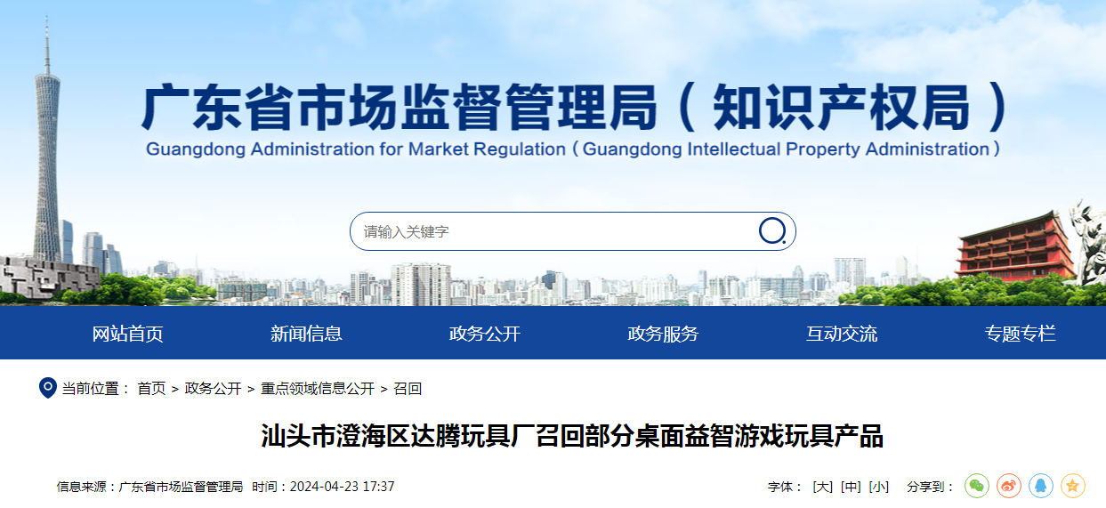 日前,汕頭市澄海區(qū)達(dá)騰玩具廠按照《消費品召回管理暫行規(guī)定》的要求,主動向廣東省市場監(jiān)督管理局報告了召回計劃,將自即日起,召回2022年8月5日至8月20日制造的部分AAA-18型號桌面益智游戲玩具,涉及數(shù)量為180盒。