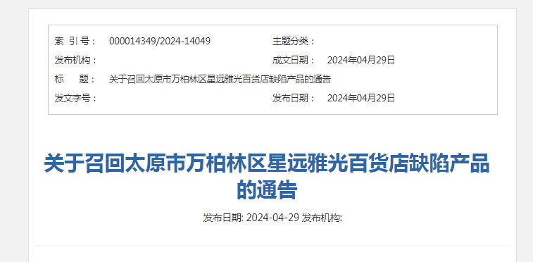 關(guān)于召回太原市萬(wàn)柏林區(qū)星遠(yuǎn)雅光百貨店缺陷產(chǎn)品的通告