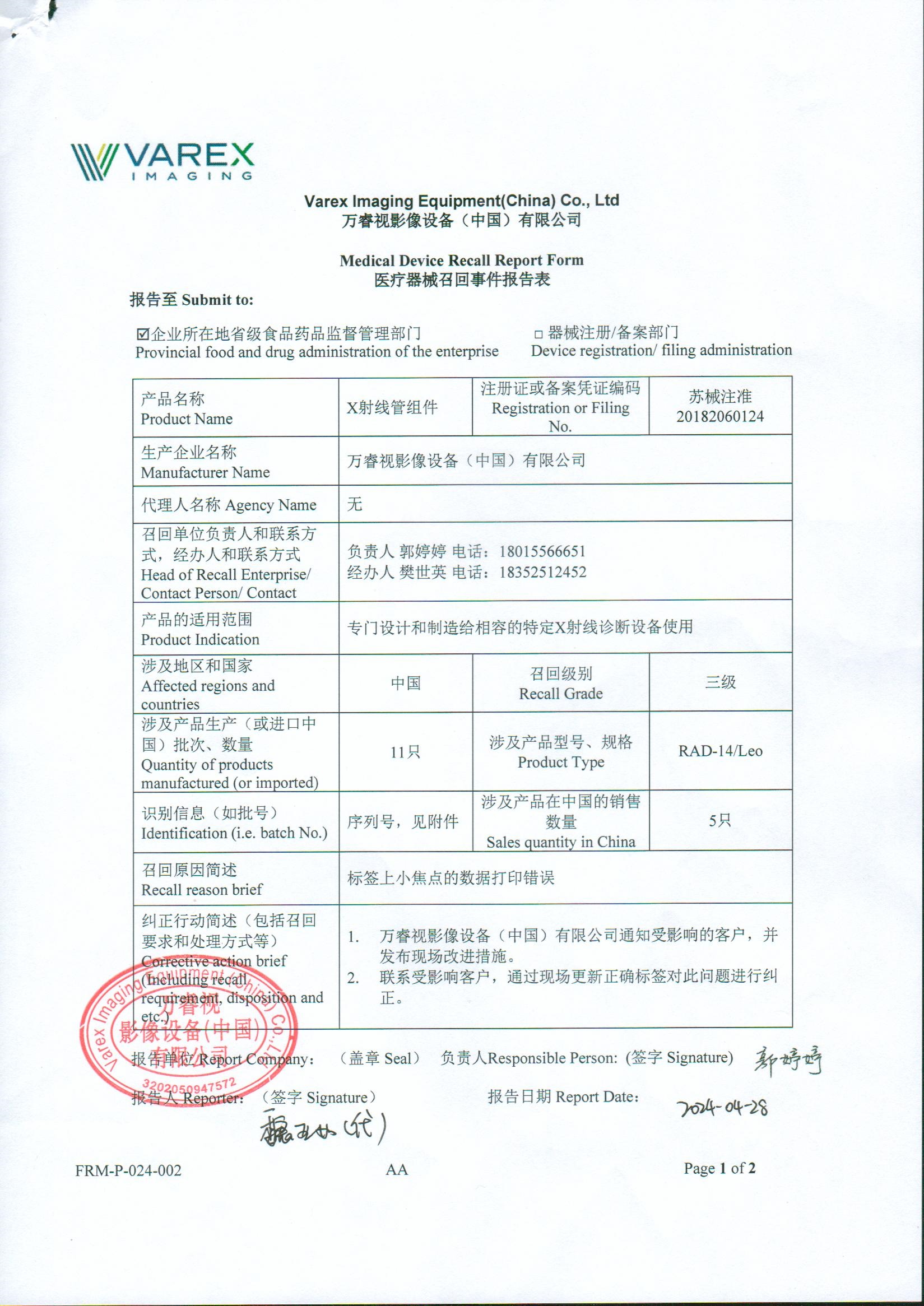 萬睿視影像設備(中國)有限公司報告,該企業(yè)發(fā)現(xiàn)X射線管組件標簽上的數(shù)據(jù)打印錯誤,現(xiàn)主動召回,召回級別為三級。涉及產(chǎn)品的具體信息見《醫(yī)療器械召回事件報告表》