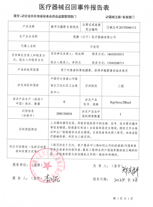 寬騰(遼寧)醫(yī)療器械有限公司報告,由于1臺數(shù)字化攝影X射線機標簽中的名稱、型號、技術(shù)要求編號等信息錯誤原因,寬騰(遼寧)醫(yī)療器械有限公司對其生產(chǎn)的1臺數(shù)字化攝影X射線機(遼械注準2019060113)主動召回。召回級別為三級召回。涉及產(chǎn)品的型號、規(guī)格及批次等詳細信息見《醫(yī)療器械召回事件報告表》。